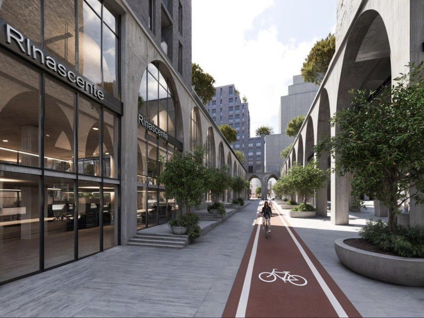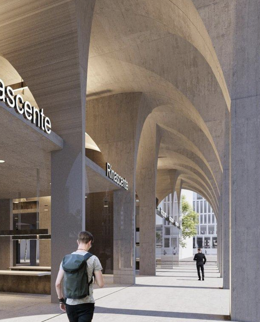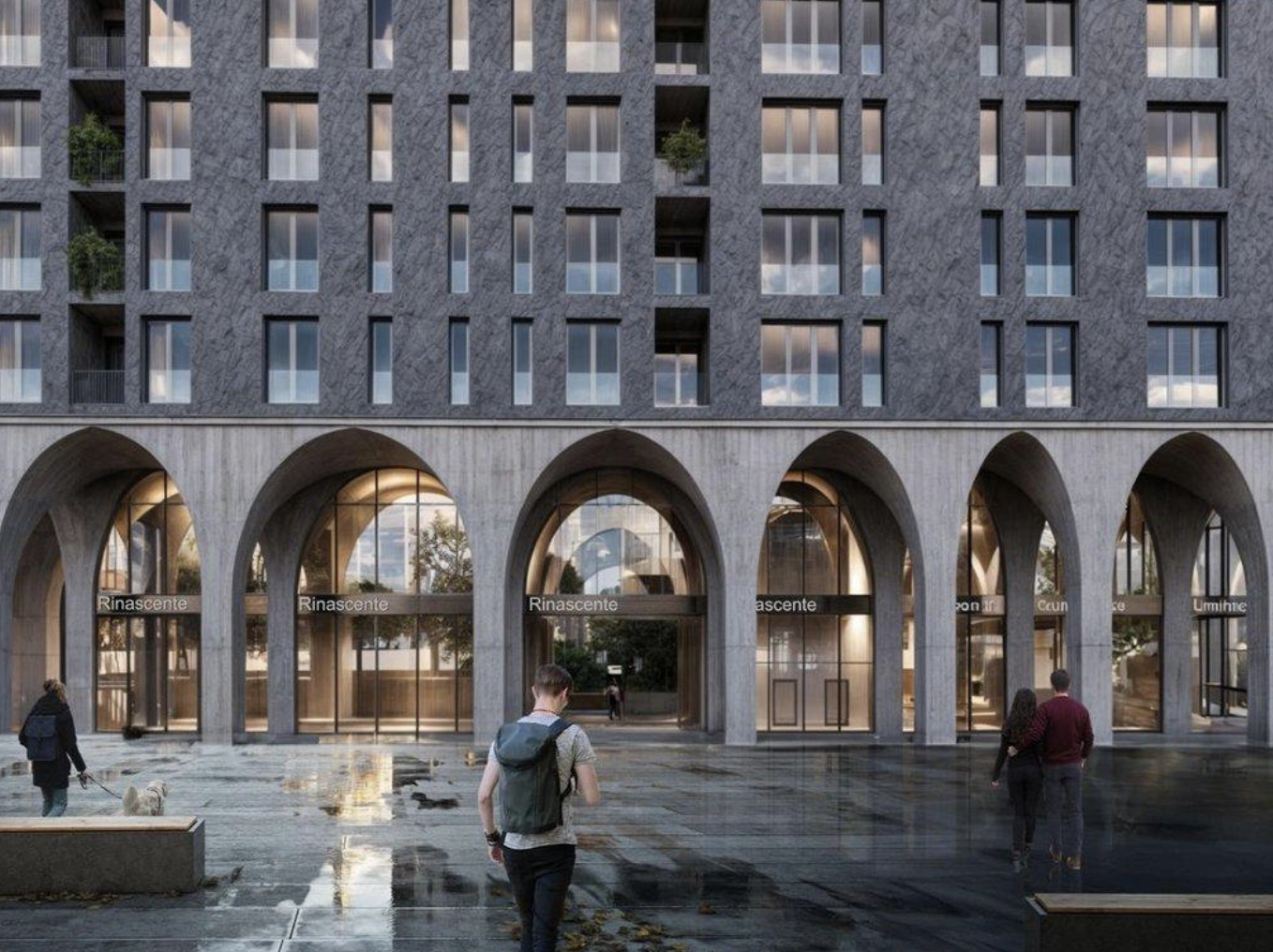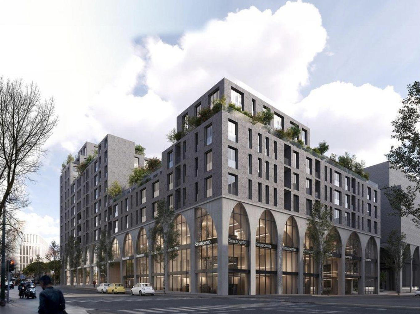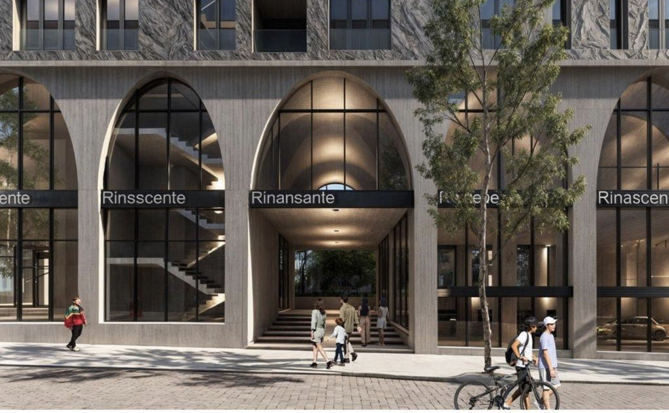 Features large ground-floor arches and a modern, energy-efficient ventilated facade, designed by Oppenheim Architecture.